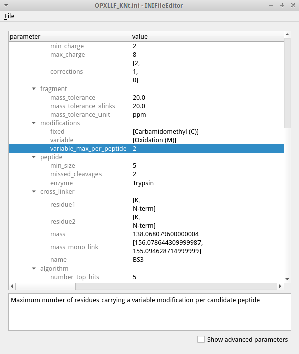 The INIFileEditor shows a description of each parameter at the bottom and helps to fill out many parameters, e.g. by using a file browser to select input and output files and showing the possible choices of parameters with limited options. To see the full list of parameters, including advanced parameters that should not be necessary for most users, check the box for advanced parameters on the bottom. The INI files can also be edited using a text editor when opening a GUI is not possible, e.g. when working on a remote server. To run a tool using the edited INI file, call the tool executable with the parameter -ini filename.ini.